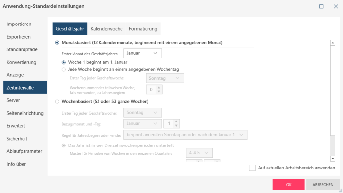 Unterteilt das Jahr in 13 Vierwochenperioden und ermöglicht die Auswahl einer Periode, in die bei Bedarf die 53. Woche gesetzt werden soll. |