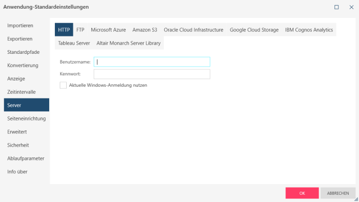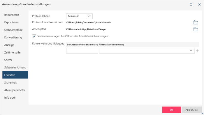 Die Standardeinstellungen der Anwendung ermöglichen das Festlegen globaler Arbeitseinstellungen (auf Anwendungsebene) für Monarch Data Prep Studio. Jede dieser Einstellungen wird im Folgenden ausführlich beschrieben.