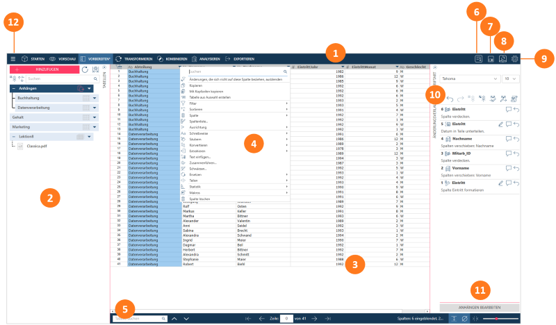 In diesem Fenster können Sie Spalten mithilfe der Datenvorbereitungs-Vorgänge für Spalten transformieren, um Ihre Daten für die spätere Analyse vorzubereiten.