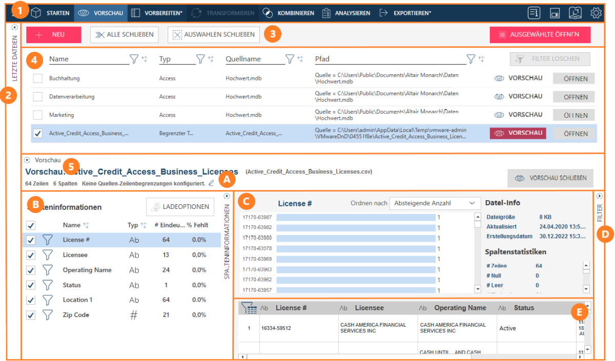 C. Spaltenstatistiken Durch Auswahl einer Spalte im Fensterbereich „Spalteninformationen“ werden alle eindeutigen Werte dieser Spalte sowie verschiedene Statistiken je nach Datentyp im Fensterbereich Spaltenstatistiken angezeigt. Für dateibasierte Datenquellen werden auch Dateiinformationen angezeigt.