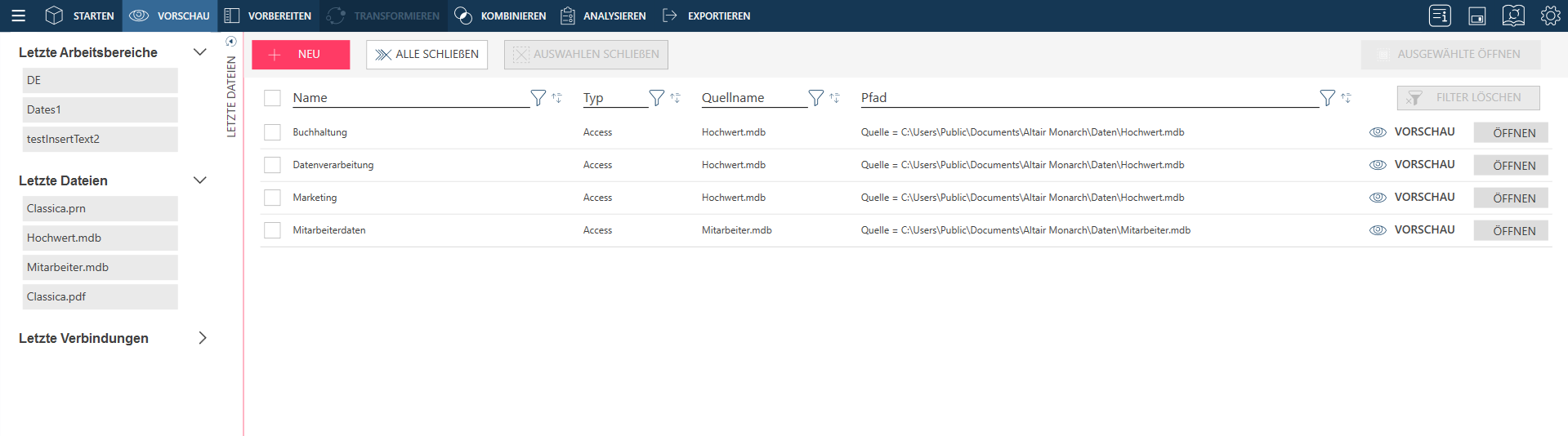 Dieser Fensterbereich kann durch Klicken auf die Schaltfläche Letzte Dateien erweitert oder ausgeblendet werden. Wenn er erweitert wird, zeigt er eine Liste aller zuletzt in der Anwendung verwendeten Arbeitsbereiche, Dateien und Verbindungen an. |