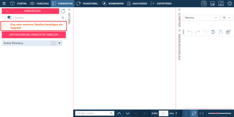 Wenn Sie Später aktualisieren wählen, wird der Arbeitsbereich geöffnet, aber die folgende Warnung wird im Tabellenselektor angezeigt: