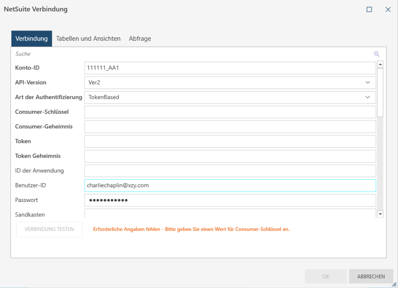 - Geben Sie die fehlenden Informationen ein (d. h. alle fett markierten Felder). Am unteren Rand des Dialogfelds werden Meldungen angezeigt, in denen Sie aufgefordert werden, die fehlenden Informationen einzugeben, die für den Connector erforderlich sind. Beachten Sie, dass Sie die Verbindungseinstellungen nicht speichern oder die Verbindung nicht testen können, wenn ein erforderliches Feld leer bleibt. Je nach Connector können Sie auch die Einstellungen für Tabellen und Ansichten und Abfrage ändern.
