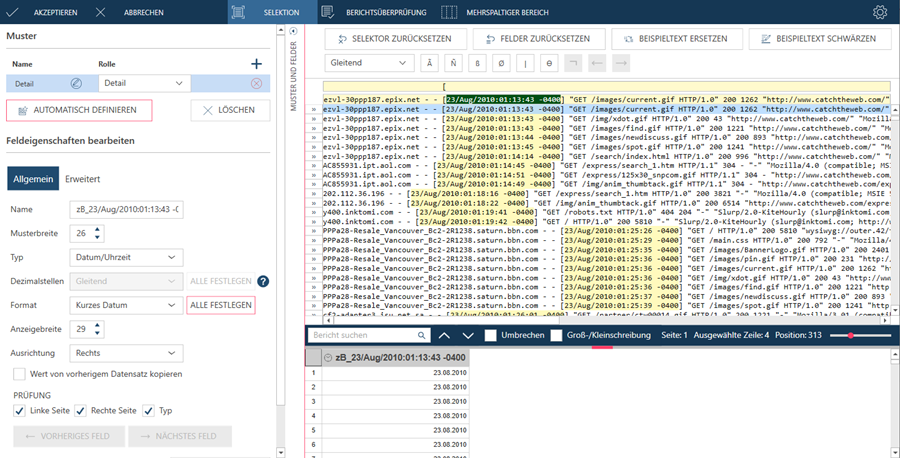 Da die Daten in diesem Bericht immer an der gleichen Stelle erscheinen, würde es verhältnismäßig einfach sein, einen Selektor zum Erfassen aller Okkurrenzen eines dieser Felder zu definieren. Es gibt jedoch auch Berichte mit ungleichmäßiger Datenplatzierung, bei denen in diesem Fall kein Standardselektor verwendet werden könnte. Im nachstehenden Bericht beginnen die Datum-/Uhrzeitfelder (z. B. 23/Aug/2008:...) an unterschiedlichen horizontalen Positionen.