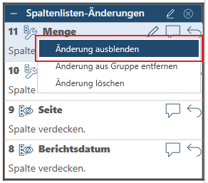 Wenn Sie eine Änderung verbergen möchten, klicken Sie mit der rechten Maustaste auf diese Änderung und wählen Sie aus den angezeigten Optionen die Option zum Verdecken der Änderung aus. Es können mehrere Änderungen verdeckt werden, indem Sie sie markieren (STRG+Klicken), mit der rechten Maustaste klicken und dann die Option zum Verdecken der ausgewählten Änderungen auswählen.