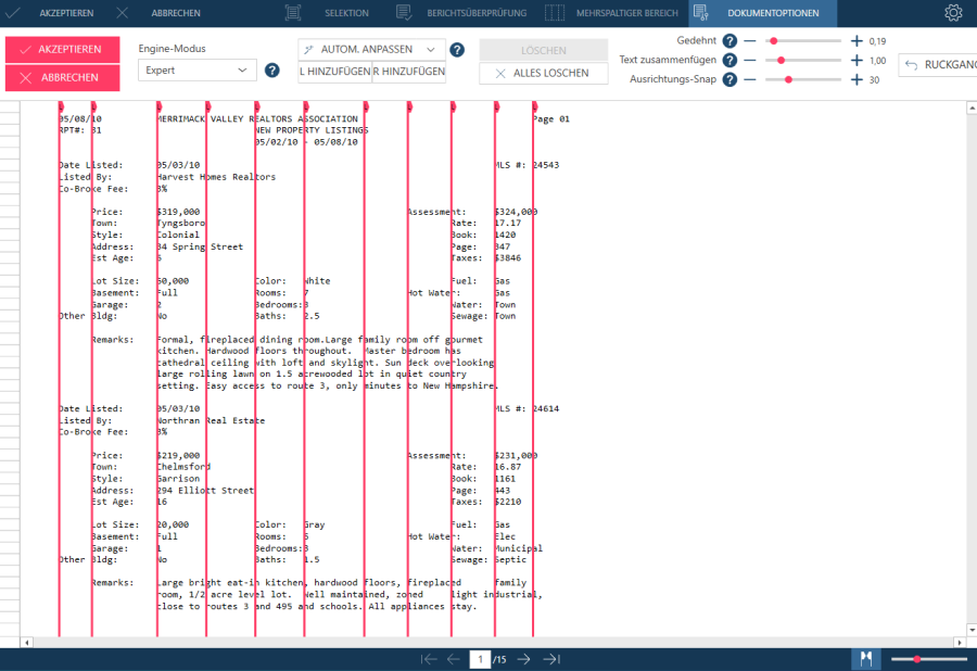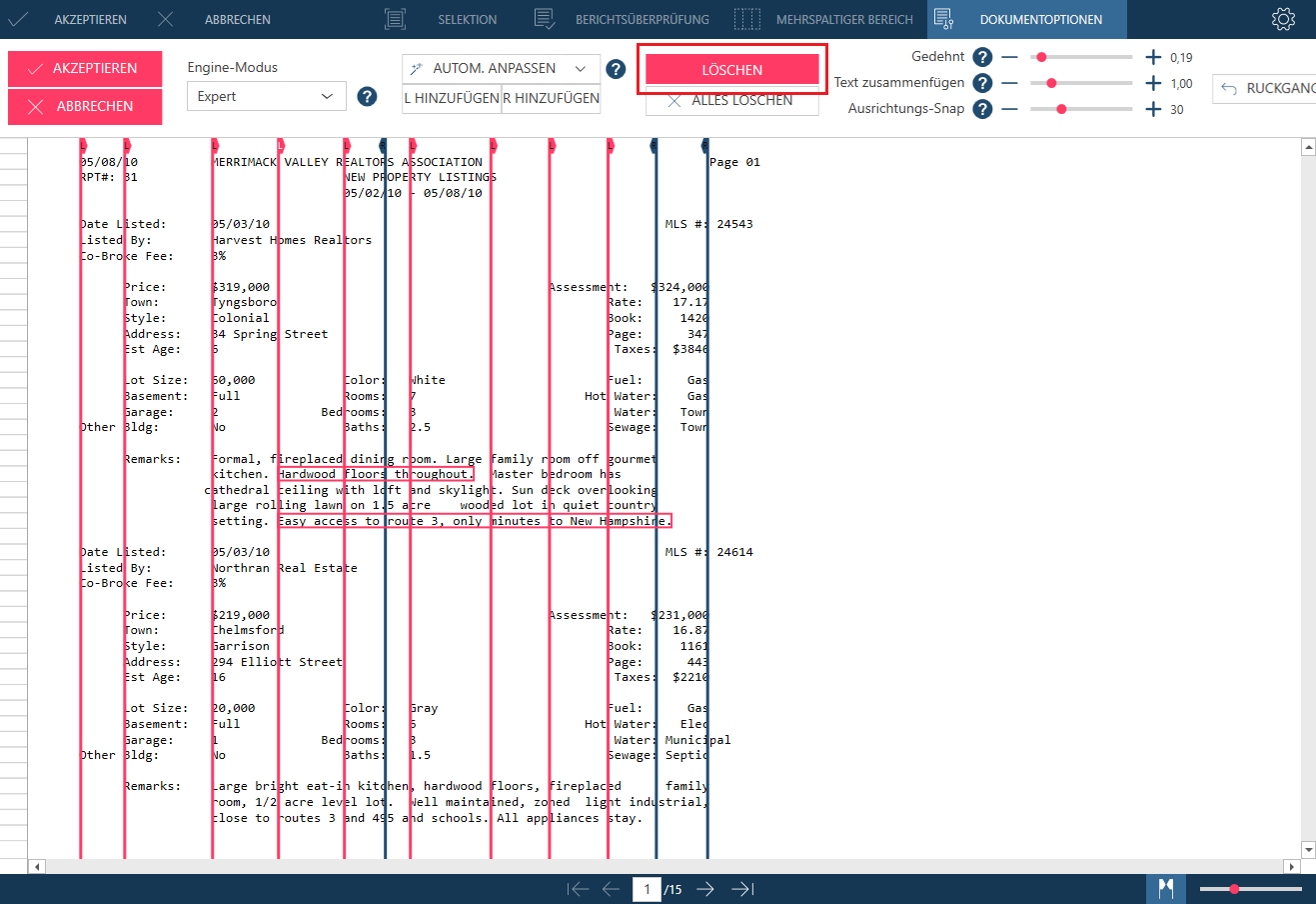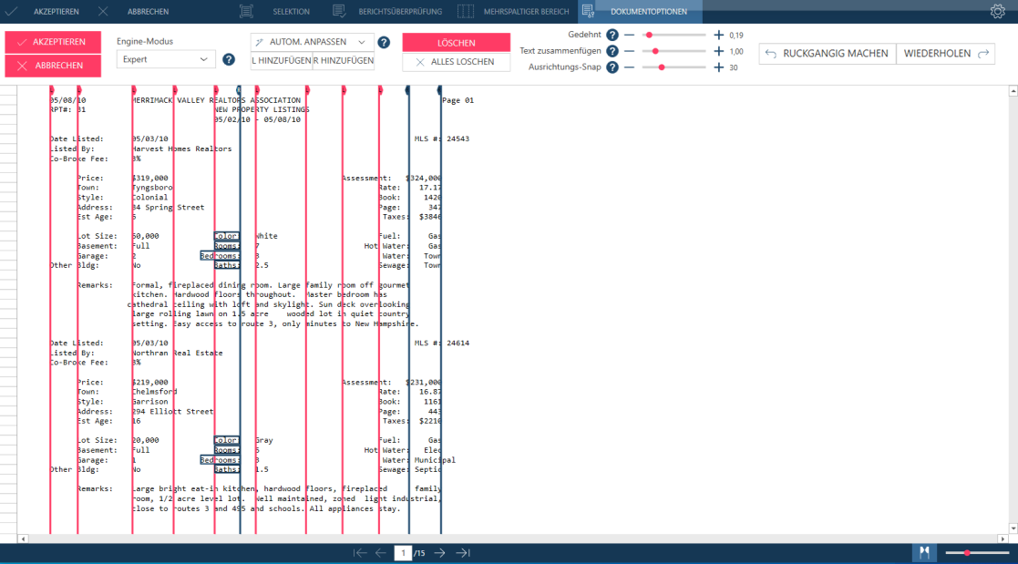 Der Experten-Engine-Modus konzentriert sich auf die Erstellung von Text, der so konsistent wie möglich vertikal in Spalten ausgerichtet ist, indem er eine manuelle Kontrolle über die Ausrichtung von eng positionierten Textgruppen ermöglicht. Dieser Modus kann verwendet werden, wenn die im einfachen Engine-Modus verfügbaren Einstellungen nicht ausreichen, um einen gut ausgerichteten Bericht zu erstellen (z. B., wenn die PDF-Datei zahlreiche unterschiedliche Schriftgrößen auf den Seiten enthält). In der folgende Tabelle sind die Eigenschaften beschrieben, die in diesem Modus geändert werden können.