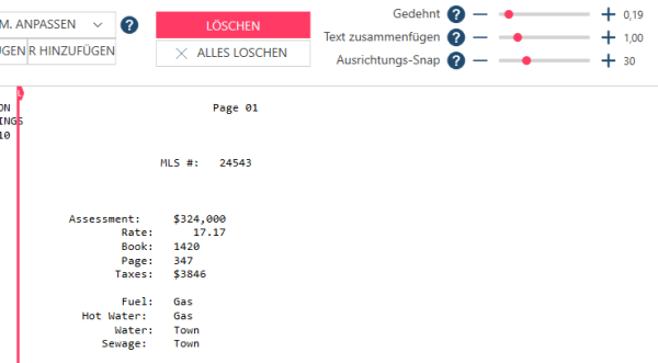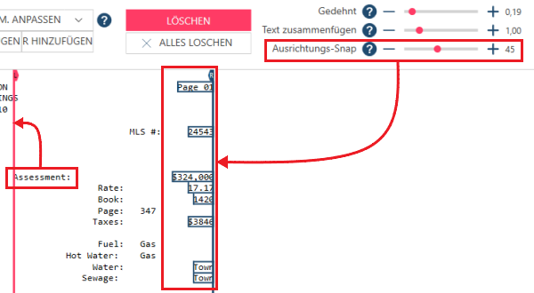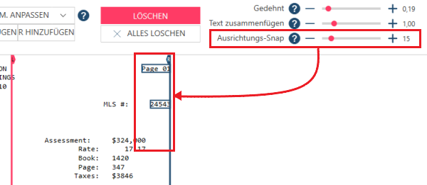 Die Eigenschaft Alignment Snap (Ausrichtungseinrastung) steuert den Abstand, sowohl links als auch rechts, den eine Ausrichtung erreichen kann, um Text für die Ausrichtung zu erfassen. Höhere Werte für diese Eigenschaft weisen die Anwendung an, Text, der weiter weg von einer Ausrichtung ist, zu ihr hin zu ziehen.