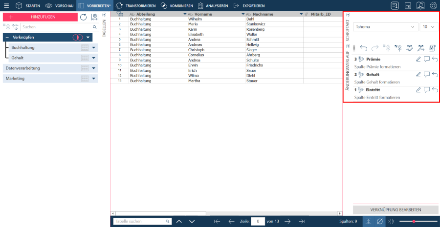 In Data Prep Studio kann die Reihenfolge der Änderungen in der Änderungsverlaufliste beliebig modifiziert werden.