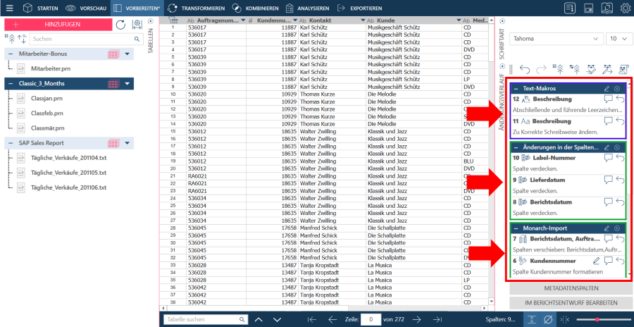 Zum Beispiel werden Änderungen, die mit einem Modell und einem Bericht in einem Projekt verknüpft sind, das in Monarch Classic erstellt und in Data Prep Studio geöffnet wurde, als Monarch-Importänderungen gruppiert. Wenn ein Textmakro mehrere Änderungen umfasst (z. B. führende und nachgestellte Leerzeichen abschneiden + in Großschreibung ändern), werden diese Änderungen als Textmakroänderungen gruppiert. Ein weiteres Beispiel: Alle Änderungen, die im Spaltenlisten-Dialogfeld vorgenommen werden, werden als Änderungen der Spaltenliste gruppiert