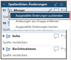 Wenn Sie nicht eine ganze Änderungsgruppe, sondern einzelne Änderungen in der Gruppe verdecken möchten, wählen Sie mit STRG+Klicken die Änderungen aus, die Sie verdecken möchten, und klicken Sie dann mit der rechten Maustaste. Klicken Sie in den angezeigten Optionen auf Änderung verdecken/Ausgewählte Änderungen verdecken aus.