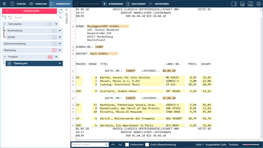 Das heißt, Sie können die robusten Mustererstellungs- und Extraktionsfunktionalitäten von Monarch Classic ausnutzen und vordefinierte Modelle zum Arbeiten mit Berichten verwenden.