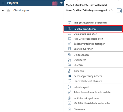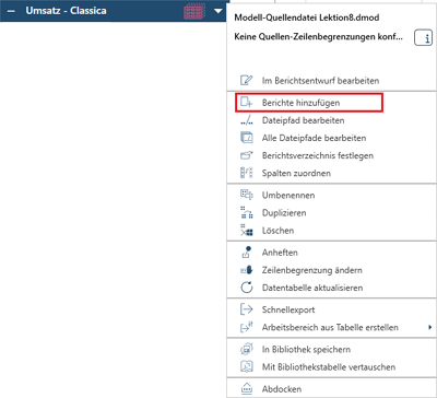 Um Daten zu sehen, müssen Berichte hinzugefügt werden, die mit Modell kompatibel sind. Wählen Sie hierzu das Dropdown-Menü neben der Haupttabelle aus und anschließend Bericht hinzufügen: