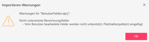 Wenn ein Projekt/Modell, das Elemente enthält, die von Monarch Data Prep Studio nicht unterstützt werden, in die Anwendung geladen wird, wird ein Warnungs-Popup angezeigt.