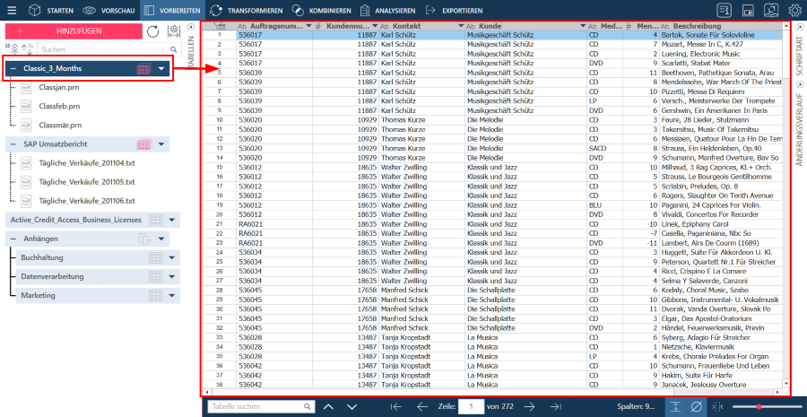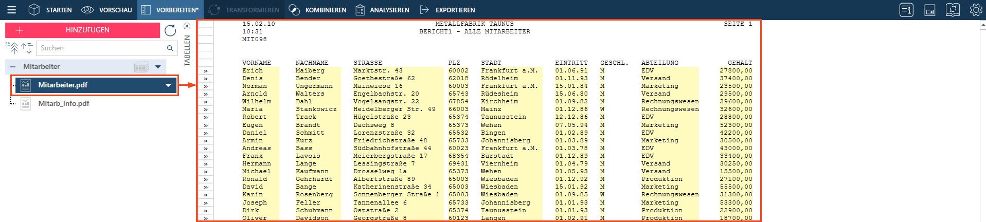 PDF- oder Berichtsdokumente, die in Data Prep Studio über den Berichtsentwurf geöffnet wurden, werden im Fenster „Vorbereiten“ als übergeordnete/untergeordnete Knoten angezeigt.