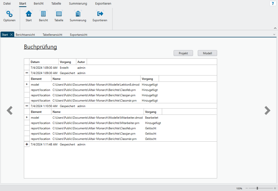 Monarch Classic zeichnet jetzt in den Modell- und Projektdateien einen Prüfpfad aller Ereignisse auf.