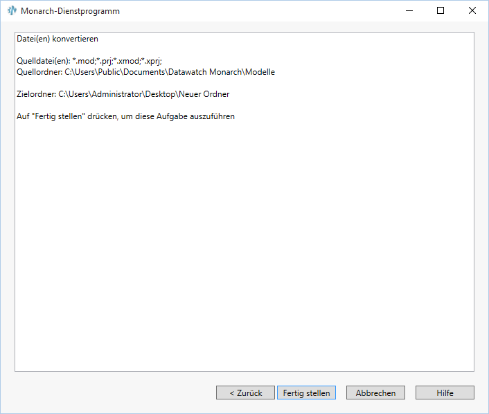 Das Monarch-Dienstprogramm bietet eine Methode zum Konvertieren der alten Modell- und Projektformate (d. h. xmod, xprj) in die Formate .dmod und .dprj, ohne dass jedes Modell und Projekt in Monarch geöffnet werden muss. Dies beschleunigt die Datenverarbeitung.