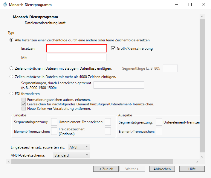 Starten Sie den Monarch Dienstprogramm Assistenten und stellen Sie sicher, dass die Schaltfläche Dateien für Monarch vorbereiten (Ersetzung, Zeilenumbrüche einfügen, EDI) ausgewählt ist. Klicken Sie auf Weiter, sobald Sie damit fertig sind.