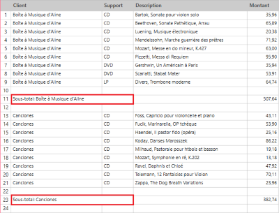 Votre récapitulatif s’affiche avec les lignes de sous-totaux.