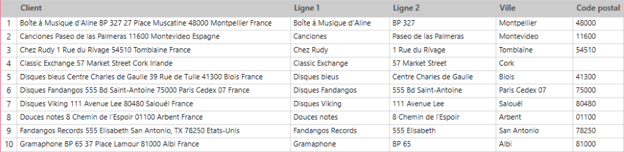 Dans cet exemple, Client est la colonne d'origine. Elle est fractionnée en quatre colonnes : Ligne 1, Ligne 2, Ville et Code Postal: