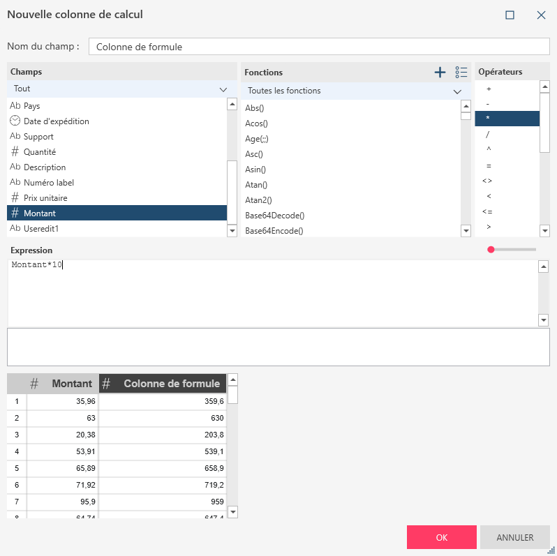Cliquez avec le bouton droit sur une colonne et sélectionnez Créer un champ calculé dans le menu contextuel. La boîte de dialogue Créer un champ calculé s'affiche.