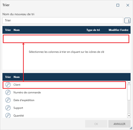 Cliquez sur l’icône de clé pour déplacer la colonne de la liste des colonnes à la liste des colonnes de tri :