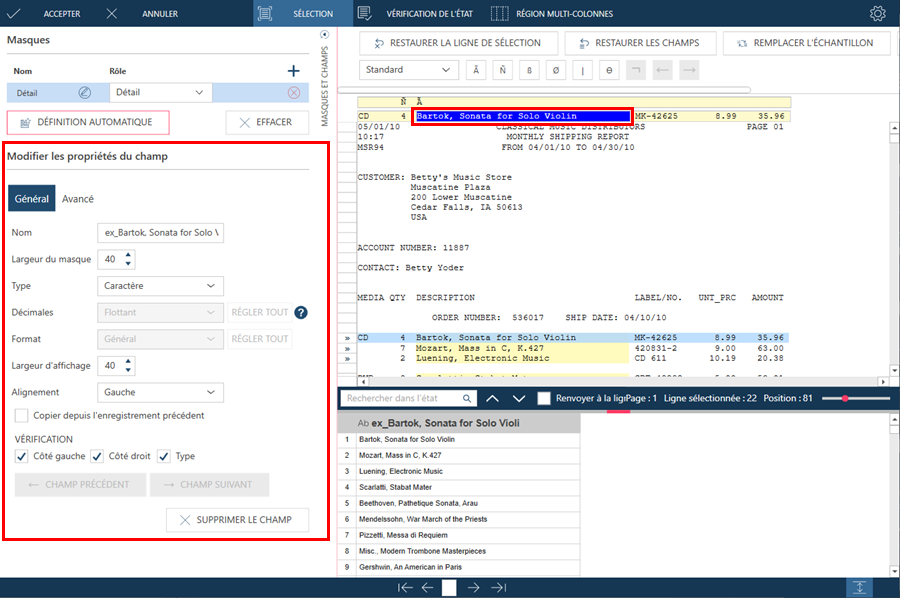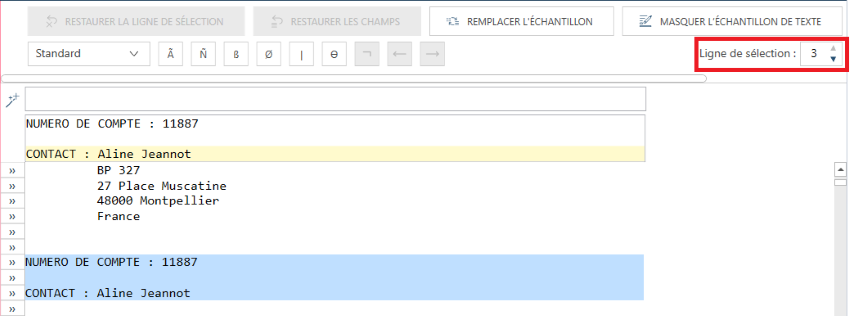 Dans certains états, les champs de détail sont présentés sur plusieurs lignes, par ex. un bloc de texte. Il peut aussi y avoir occasionnellement des caractéristiques uniques qui identifient la première ligne d’un bloc de texte. S’il est impossible d’utiliser cette première ligne, sélectionnez une autre ligne, dotée de caractéristiques uniques. Vous devez dans ce cas indiquer la ligne d’échantillon sur laquelle opérer la sélection via le champ Ligne de sélection.