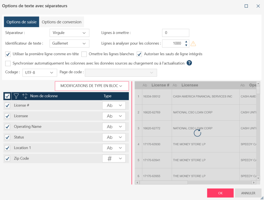 Remarque : Vous pouvez spécifier un type de données pour chacune des colonnes de votre source de données texte avec séparateurs en utilisant les listes déroulantes Type proposées à droite de chaque colonne.