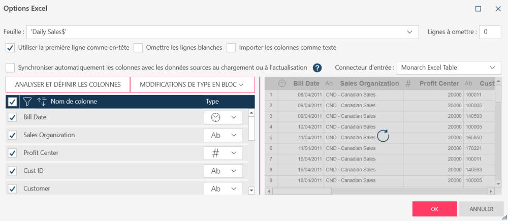 Cette option est désactivée si le connecteur d’entrée Monarch ACE OLE DB (ancien) est utilisé, ou si l’optionSynchroniser automatiquement les colonnes avec les données sources au chargement ou à l’actualisation est sélectionnée.