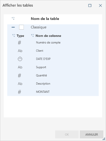 Lors de l’exportation d’une table vers un fichier qui existe déjà, ce paramètre vous permet de voir les tables et colonnes existantes du fichier de destination et de sélectionner la table à laquelle les données doivent être ajoutées ou dont elles doivent remplacer les données. Quand une table de la boîte de dialogue Afficher les tables est sélectionnée et confirmée, son nom s’inscrit dans la zone de texte Nom de la table et le contenu actuel de cette zone est remplacé. Les tables affichées dans la boîte de dialogue Afficher les tables peuvent être triées en fonction de leur nom en cliquant sur l’icône Trier de l’en-tête. Chaque table s’accompagne d’un bouton de développement qui permet d’en afficher la liste de colonnes.