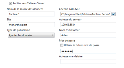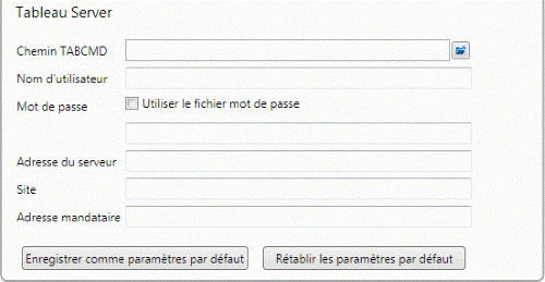Les éléments suivants peuvent être précisés pour établir une connexion à Tableau Server :