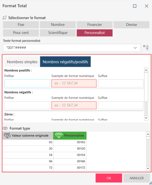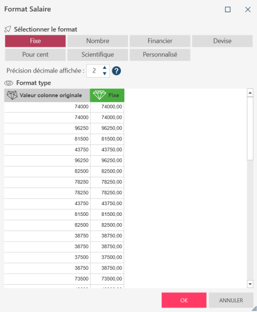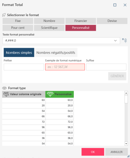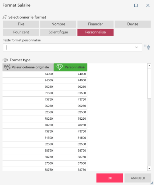 Sélectionnez l’un des formats prédéfinis (Fixe, Nombre, Financier, Devise, Pourcentage, Scientifique) pour les appliquer à vos colonnes numériques. Vous pouvez aussi sélectionner Personnaliser pour définir votre propre formatage :