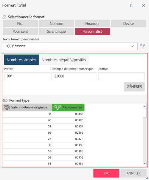 Pour formater des nombres positifs, négatifs ou égaux à zéro, vérifiez que l’onglet Nombres négatifs/positifs est sélectionné, puis spécifiez un exemple de format et le préfixe et/ou le suffixe de votre choix pour vos nombres positifs, négatifs ou égaux à zéro. Cliquez sur le bouton Générer pour produire un échantillon de l’aspect de vos nombres une fois le format sélectionné appliqué. Notez que le bouton Générer est désactivé quand vous n’avez pas spécifié de format personnalisé pour un type de nombre spécifique (positif, négatif et zéro) ou quand vous saisissez des caractères alpha ou spéciaux dans l’un des champs d’exemple Format numérique de cet onglet.