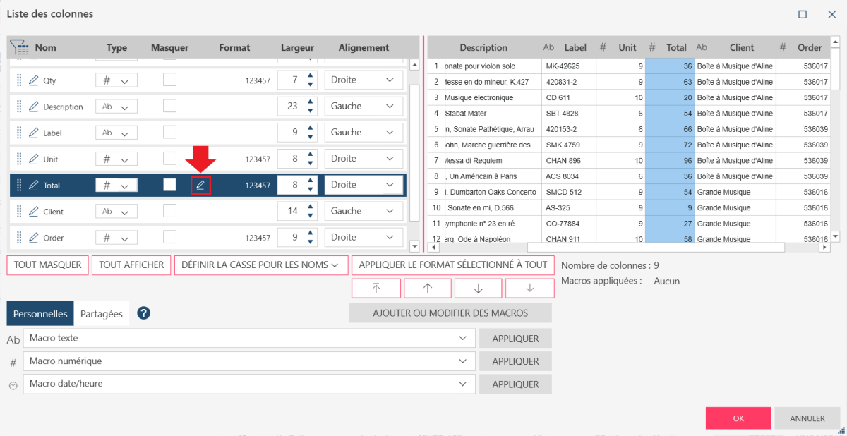 Cliquez sur l’icône Modifier le format située à côté de la colonne numérique que vous souhaitez mettre en forme :