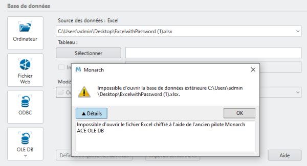 Cochez la case Toujours substituer le moteur Modern lors du chargement d’un projet ou d’un modèle qui utilise le moteur hérité si vous souhaitez que Monarch Classic utilise exclusivement le moteur Modern lors de l’importation d’un fichier Excel qu’il détecte comme utilisant le moteur Legacy (pour les anciens fichiers). Une option permet également de convertir les modèles ou projets actuellement ouverts (quel que soit le moteur utilisé) vers le moteur moderne, puis de les recharger. Monarch Classic ne peut pas ouvrir les fichiers Excel protégés par mot de passe via le connecteur ACE OLE DB. Dans ce cas-là, il convient d’utiliser le moteur Modern.