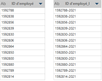 Dans cet exemple, la première colonne (ID d'employé) est la colonne d’origine. La chaîne de texte -2020 est ajoutée à la fin de toutes les lignes de la dernière colonne (ID d'employé_I).
