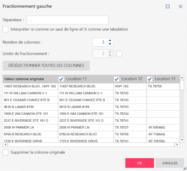 Vous pouvez modifier le nombre de colonnes et la limite de fractionnement en spécifiant les valeurs souhaitées pour ces champs. En reprenant l'exemple ci-dessus, si le nombre de colonnes est réduit à 2 et que la limite de fractionnement de 2 est conservée, l'opération de fractionnement pour les colonnes 11857 Research Blvd, Hwy 183 Austin, TX 78759 donne deux colonnes : l'une contenant la valeur 11857 Research Blvd et l'autre contenant la valeur Hwy 183 Austin. Si, au contraire, la limite de fractionnement est fixée à 1 et que le nombre de colonnes de 3 est conservé, l'opération de fractionnement produit trois colonnes : une contenant la valeur 11857 Research Blvd, une contenant la valeur Hwy 183 Austin, TX 78759, et la troisième ayant une valeur nulle.