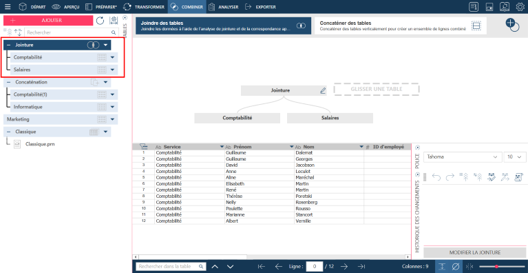 dans le coin supérieur droit de l’espace d’étape Combiner. Cette commande supprime toutes les tables déjà mises en place à l’étape de jointure, de même que la jointure définie précédemment, laissant l’espace libre pour la nouvelle création. Vous pouvez maintenant commencer à créer la jointure.