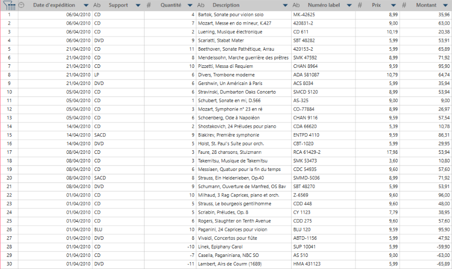 Les mesures sont des champs numériques tabulés pour chaque ensemble de valeurs unique identifié dans les champs-clés. Ainsi, à la figure 3, le champ Montant est réparti en plusieurs totaux distincts pour chaque type de support d’enregistrement.