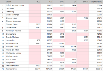 Figure 6. Récapitulatif bidimensionnel (croisé) affichant les ventes par client et par type de support.