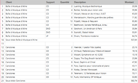 Le récapitulatif illustré à la figure 5 repose sur les champs Client, Support, Quantité et Description comme champs-clés et le champ Montant comme mesure. Le récapitulatif affiche les transactions individuelles pour chaque type de support, par client. Les sous-totaux sont calculés au niveau Support et Client.