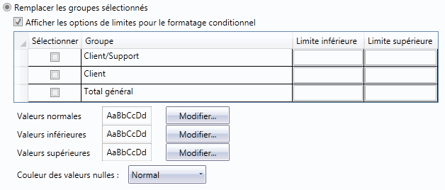 Sélectionnez les groupes que vous souhaitez colorer puis cliquez sur Modifier à côté de la zone d'aperçu des valeurs normales pour afficher la boîte de dialogue Propriétés des couleurs. Servez-vous de cette boîte de dialogue pour définir la couleur du texte, la couleur de remplissage, le style de motif et la couleur du motif. Sélectionnez également des valeurs pour Couleur des valeurs nulles afin de définir la couleur des champs de valeurs nulles. Définition des couleurs pour le formatage conditionnelSi vous souhaitez définir des couleurs pour le formatage conditionnel, cliquez sur Afficher les options de limites pour le formatage conditionnel. L'écran vous permettra d'indiquer les limites inférieure et supérieure pour chaque groupe :