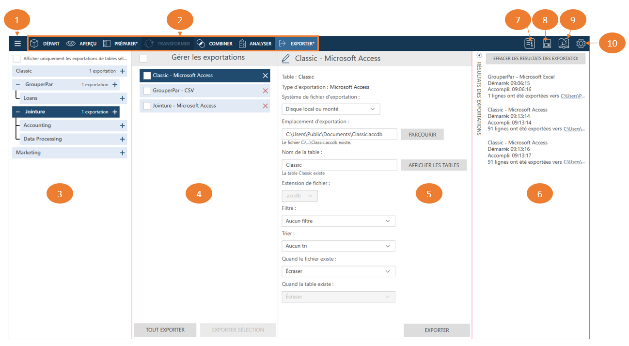 La fenêtre Exporter permet d’exporter des tables préparées vers différents formats, notamment :