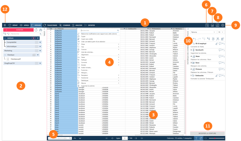 La fenêtre Préparer permet de transformer les colonnes, à l’aide des opérations de préparation des données, afin de préparer vos données en vue d’une analyse ultérieure.