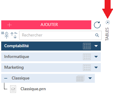 Bibliothèque de sources de données Vous pouvez enregistrer vos espaces de travail et tables dans la Bibliothèque de sources de données. Cette icône donne accès à la boîte de dialogue Bibliothèque. |