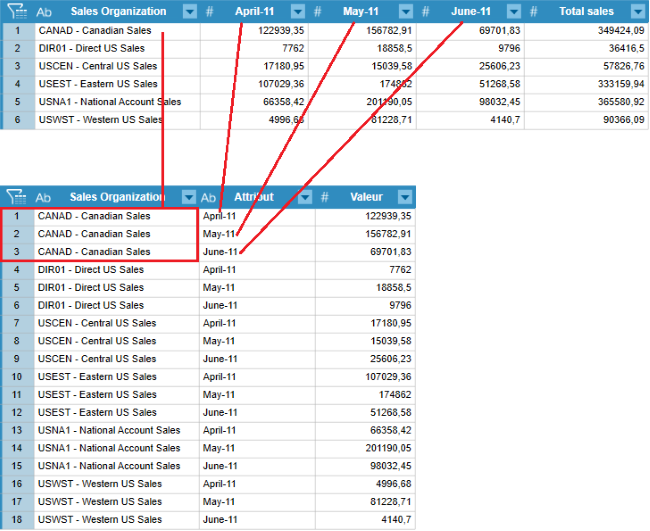 Nous pouvons dépivoter les colonnes de mois (avril, mai et juin) pour qu’elles deviennent des attributs d’Organisation de vente et soient distribuées comme des valeurs de ligne.