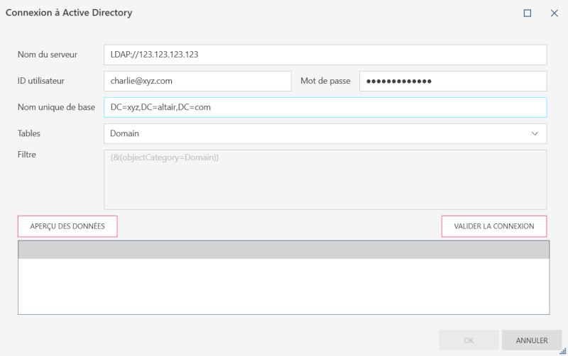- Vérifiez que les paramètres de connexion et le nom de la table sont corrects. Vous pouvez tester la connexion en cliquant sur le bouton Valider la connexion et prévisualiser la table en cliquant sur Aperçu des données. Selon le connecteur, vous pouvez également modifier les paramètres pour Tables et vues et Requête. Une fois que vous avez terminé, cliquez sur OK.