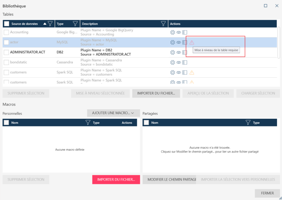 Il est possible de mettre à niveau les sources de données obsolètes des fichiers de bibliothèque comme décrit ci-dessus. Si votre fichier de bibliothèque contient des tables obsolètes, l’avertissement suivant s’affiche :