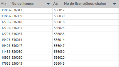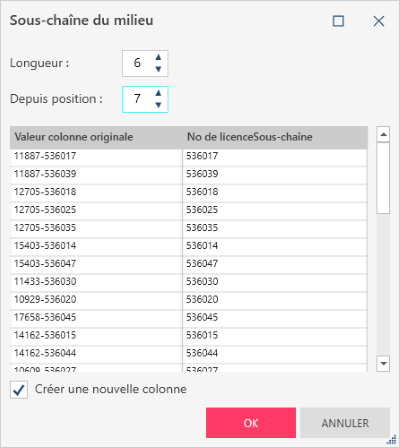 Dans cet exemple, LicenceN° est la colonne d’origine. Six caractères sont extraits à partir de la position 7 pour produire les valeurs dans LicenceN°Sous-chaîne.