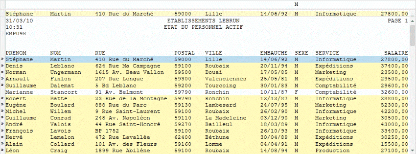 Dans le graphique illustré ci-dessous, remarquez le « M » mis en surbrillance sur la ligne de sélection. Ce « M » sert actuellement à limiter la capture aux données relatives aux employés de sexe masculin (remarquez que les données du sixième employé de la liste, « Marianne Stancort », ne sont pas capturées).