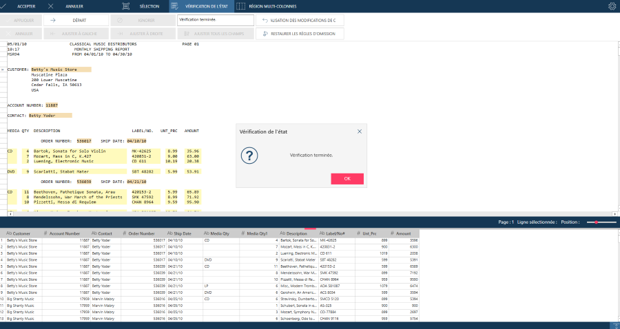 La fenêtre Vérification de l’état affiche l’état de l’opération. Si la vérification détecte une erreur de limite de champ, la fenêtre Vérification de l’état permet de la corriger, puis de reprendre l’opération.